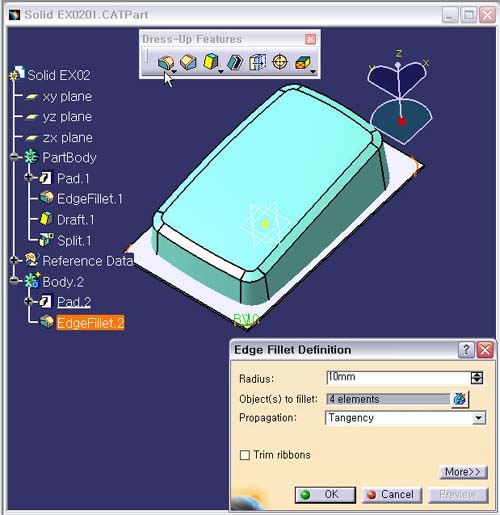1. Fillet ÀÛ¾÷Çϱâ Radius : 10mm Object(s) to Fillet : 4 elements(Pad.2 ¼Ö¸®µå ¼¼·Î ¸ð¼¸® 4°³)